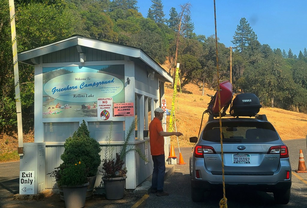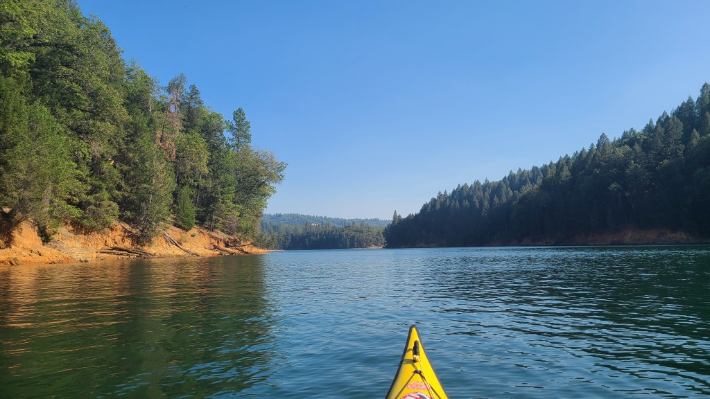 Given the smoky conditions in the area due to many wildfires, the chances for the Rollins Lake Forward Stroke Clinic were iffy. Chris had said he would let us know around noon if the paddle was off. I checked email at 1:00 and there was no message, so I prepped for the paddle. (Okay, I had a short nap first given midday smoke before loading my kayak.) The AQI forecast for the 4:00 pm meetup time was 87. I left home for Rollins at 3:15… without rechecking my email.