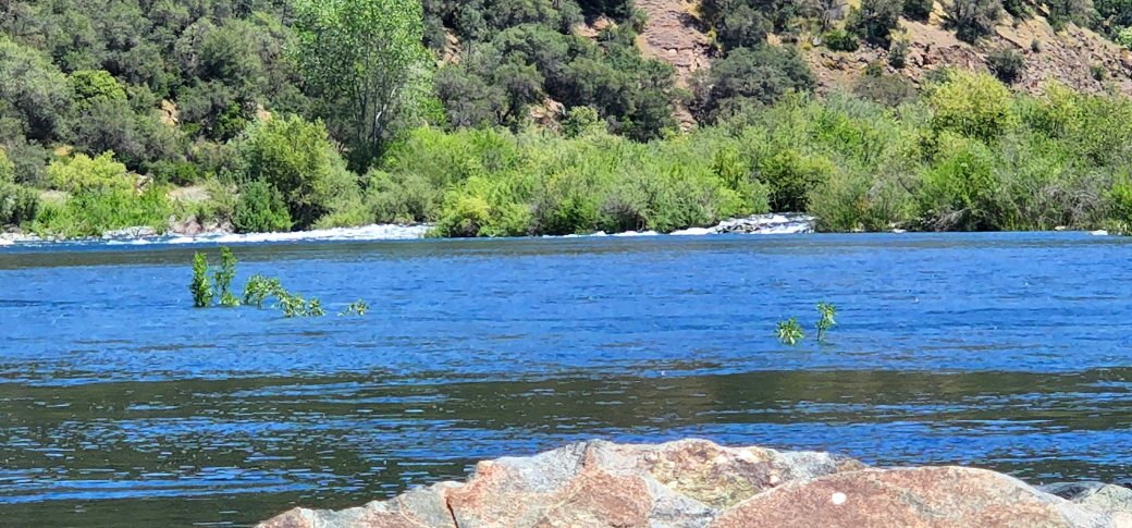The lake was high, like 6 ft. up over recent years. We paddled through flooded trees with great reflections, as there was little wind. We headed towards the North Fork of the American River to the inlet which had falls at end. At 4 miles from the launch, the GPS said one more mile to whitewater.