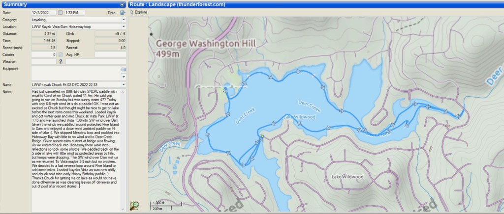 I had just cancelled my 80th birthday paddle when Chuck Hart called me at 11:00 am. He said, yep going to rain on Sunday, but today is sunny, and warm (47?). And with wind only 6-8 mph, let’s do a paddle! I was not quite as excited as Chuck, but thought might be nice to get on lake before the next rain.
