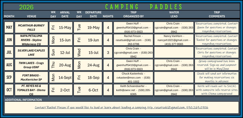 Spring is a beautiful time to be on the water. Below are schedules for the 2026 paddling season. Included in the schedules are calls for members to help organize and lead some of the scheduled trips. If you are interested, contact Rachel (SNCKC Trips Chair) at rasatsuki@gmail.com.