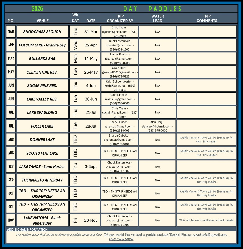 To join a Day Paddle, mark your calendars and wait for a broadcast announcement from the trip organizer which should be about 2 weeks in advance of the trip. However, if you have missed the announcement or think you have waited too long, contact the listed Trip Organizer to get on the roster of trip participants.