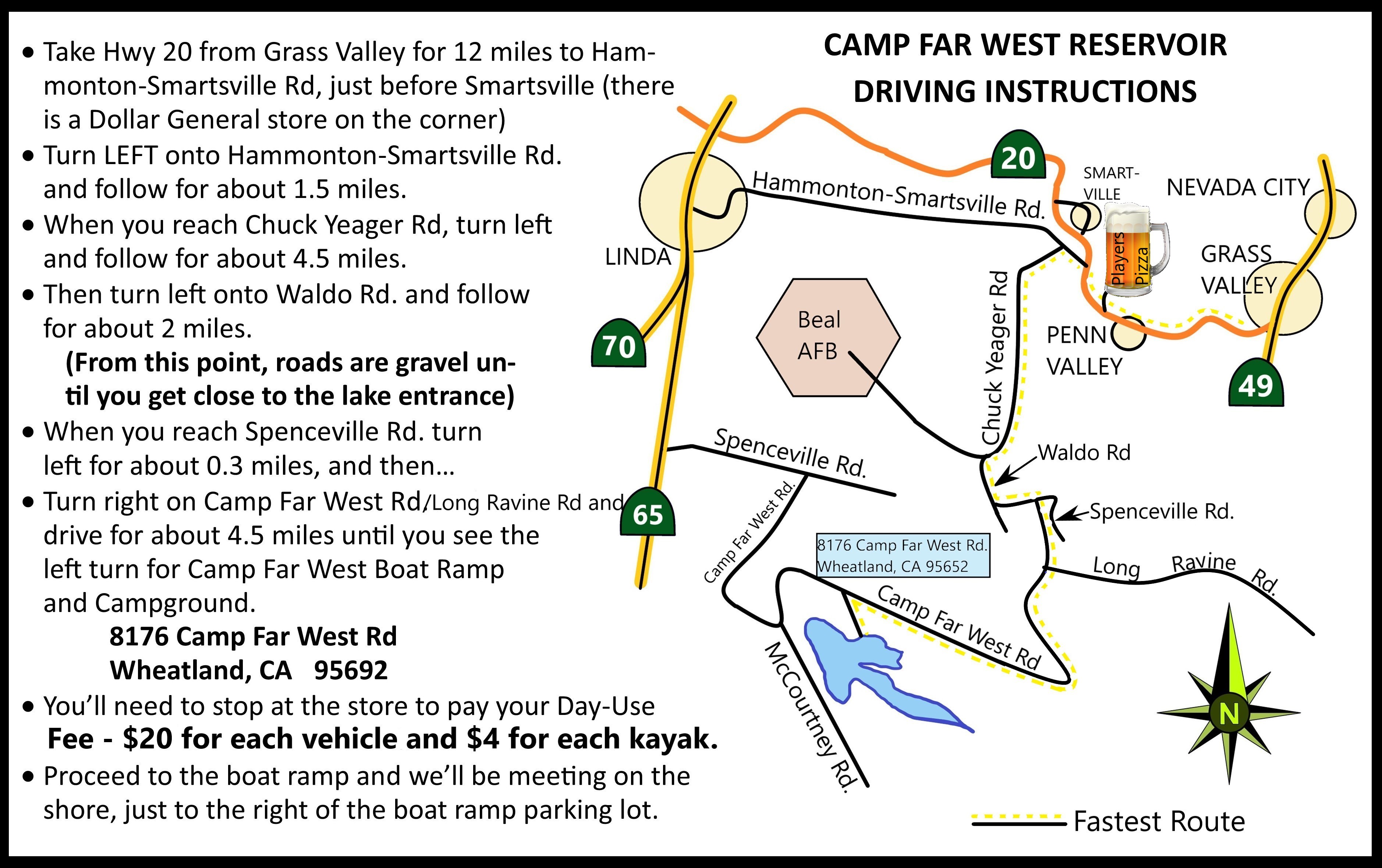 | Camp Far west Reservoir | D&C | 30 M / 0.75hr | 39° 2’51.55″N 121°17’54.21″W | Beginner – Intermediate | Afternoon winds / Expensive | Map Driving Directions Notes/Past Trips | PIX1 |